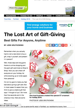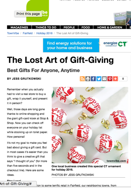 Hey Fairfield, look out for our hand painted ornaments in this months edition of Fairfield Magazine! We are thrilled to be spotlighted, alongside a few of our favorite local brands, in this unique gift guide! The Lost Art Of Gift Giving, written by Jessica Grutkowski, is a must read for any CT local looking for great gift ideas this season!