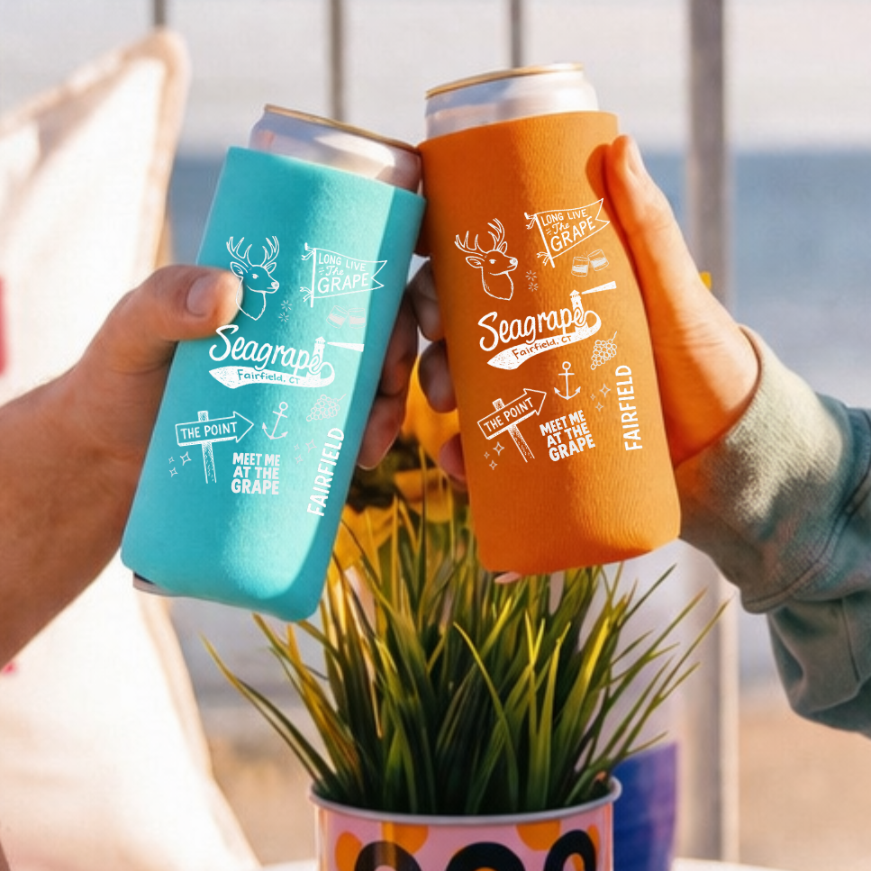Designed for seltzers and slim cans, this lightweight cooler features a fun, custom Seagrape doodle print that brings a little extra personality to every sip. Perfect for beach days, boat rides, and Seagrape nights, it’s an easy grab-and-go essential for repping your favorite local spot in style.