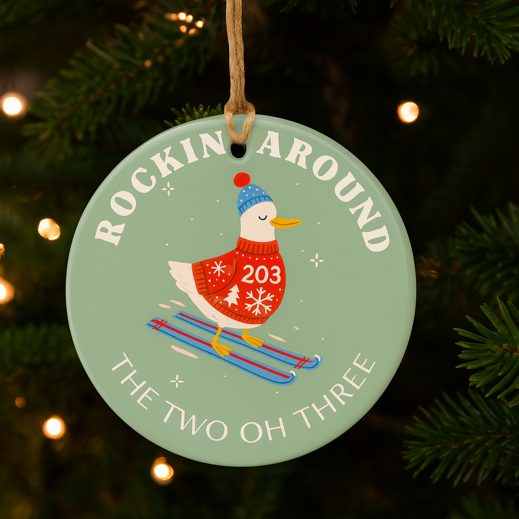 Bring a little Connecticut magic to your holidays with our “Rockin’ Around The 203” Ceramic Ornament. This glossy 3-inch keepsake features our winter-skiing seagull.