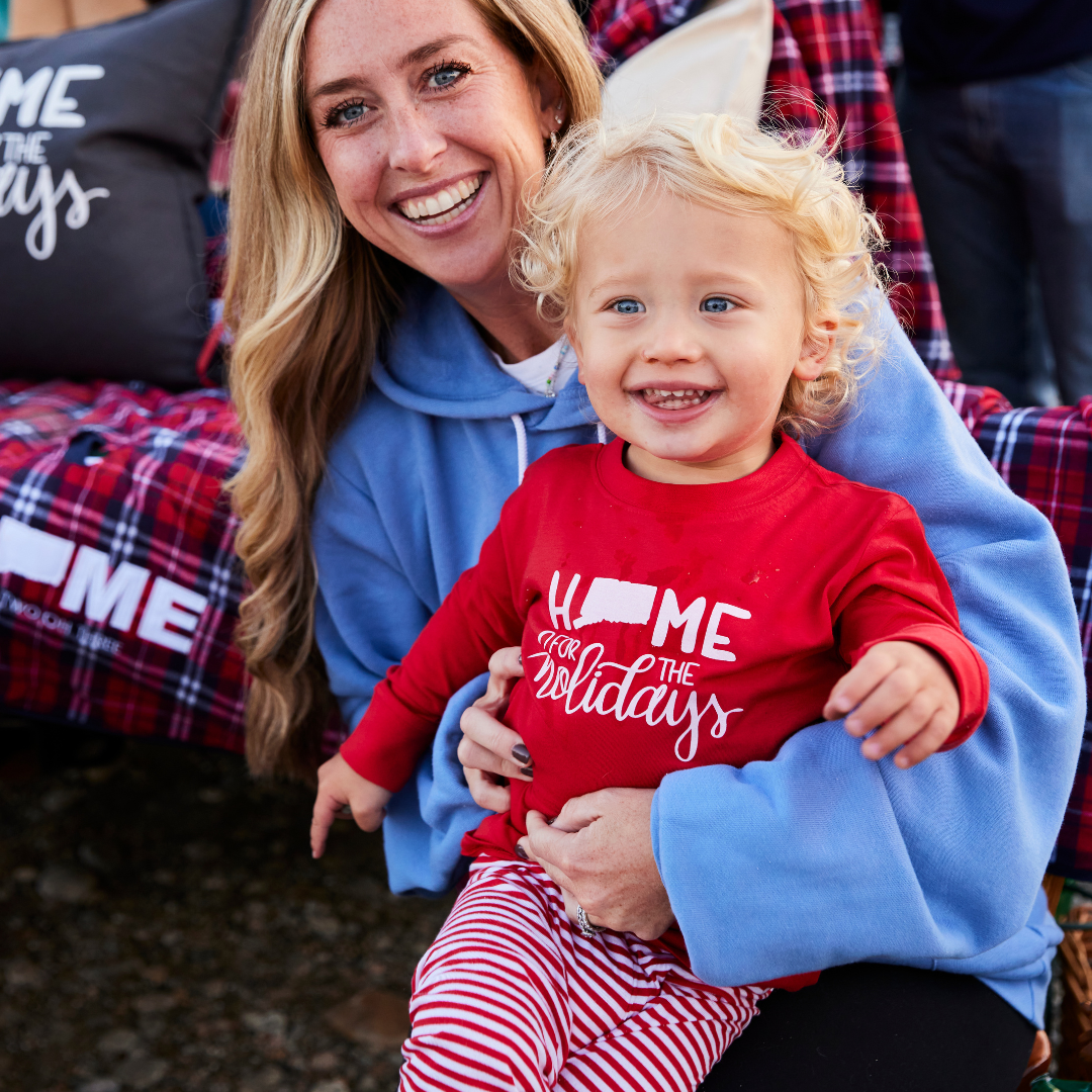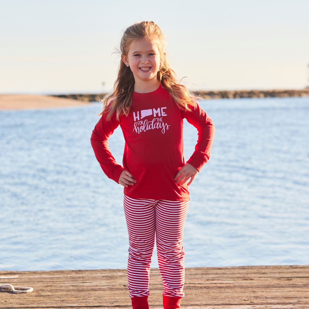 Wrap Them in Connecticut Cheer! Made from an ultra-soft cotton blend, these festive PJs are as comfortable as they are adorable. The long-sleeve top features our exclusive Connecticut-themed Home for the Holidays design, perfectly paired with cheerful red-and-white striped pants.