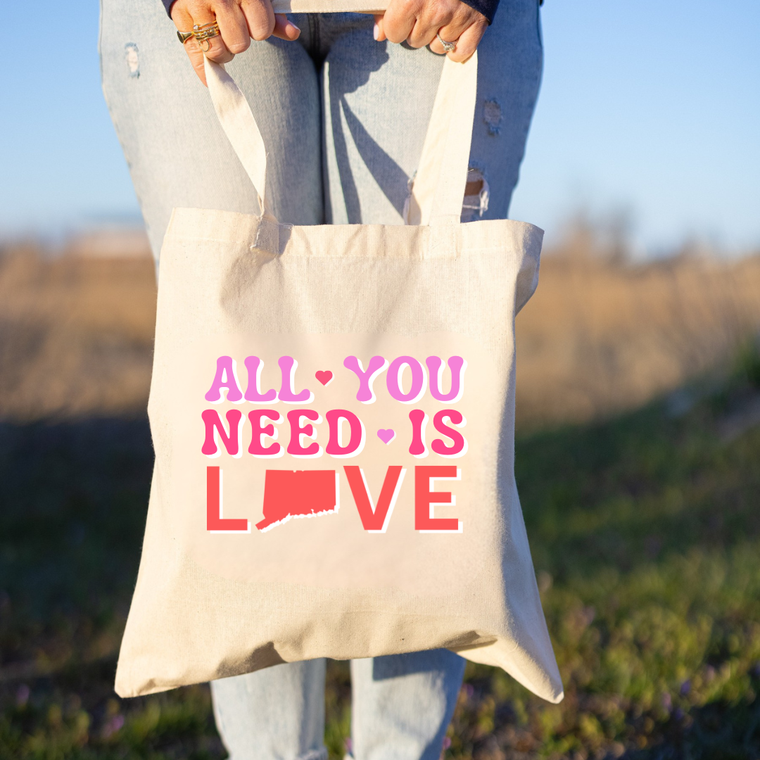 Carry your Connecticut pride wherever you go with our limited edition All You Need Is Love Canvas Tote Bag.