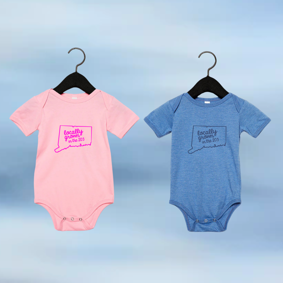 Our Locally Grown 203 Onesies are made from an ultra-soft, buttery fabric and make the perfect Connecticut baby gift. Show off your CT pride with onesies designed for the littlest 203 locals!